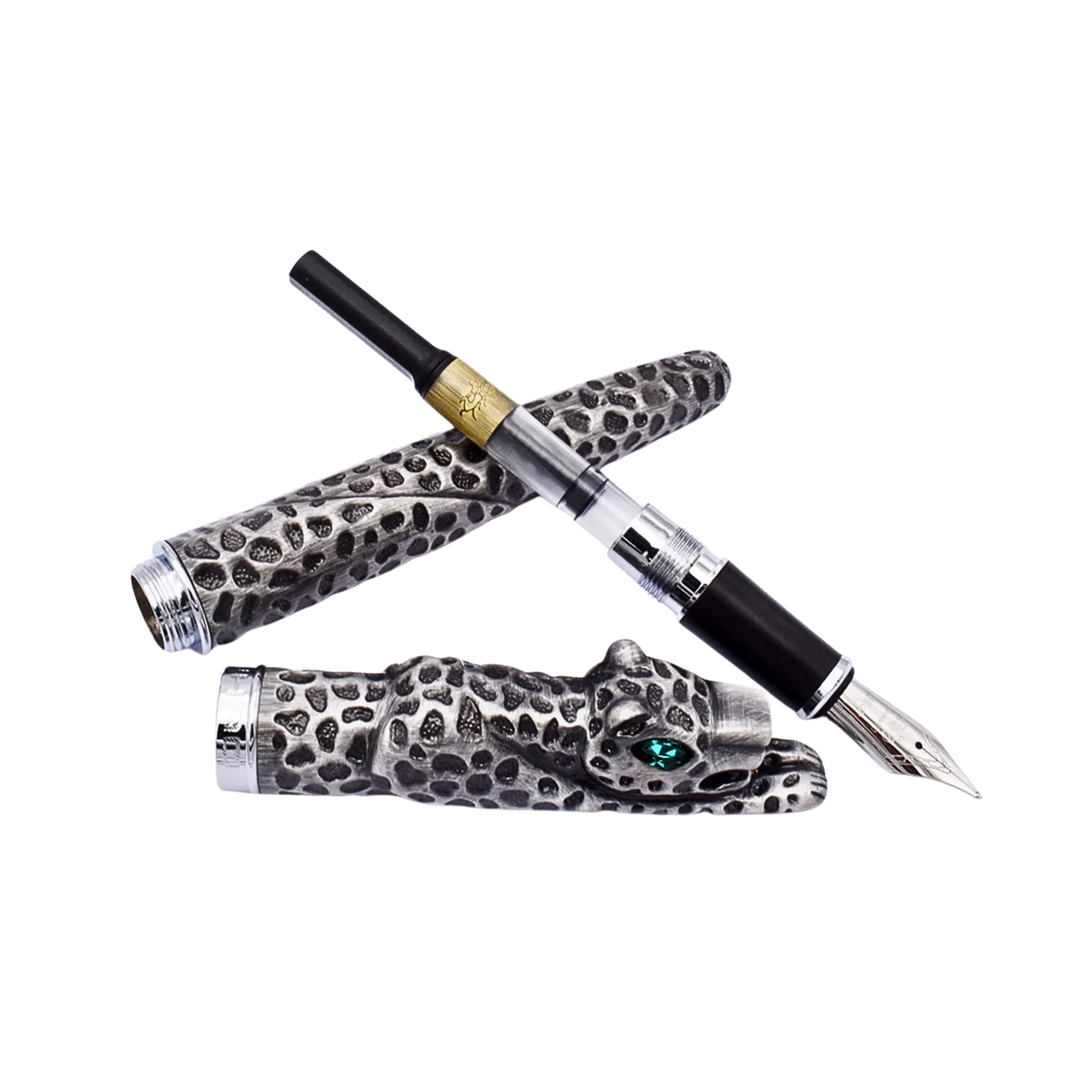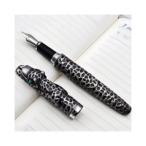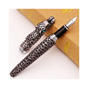 Turn writing into a statement with this striking Jinhao Hunter Edge Fountain Pen — a true blend of craftsmanship and artistry. Designed as a collector’s piece yet fully functional for daily use, the pen features a meticulously textured metal body inspired by a leopard’s coat, complete with a detailed sculpted head and vivid emerald-style eyes. Every element of the pen is built to stand out. The antique silver finish highlights the deep engraved pattern across the barrel and cap, giving it a handcrafted appearance.