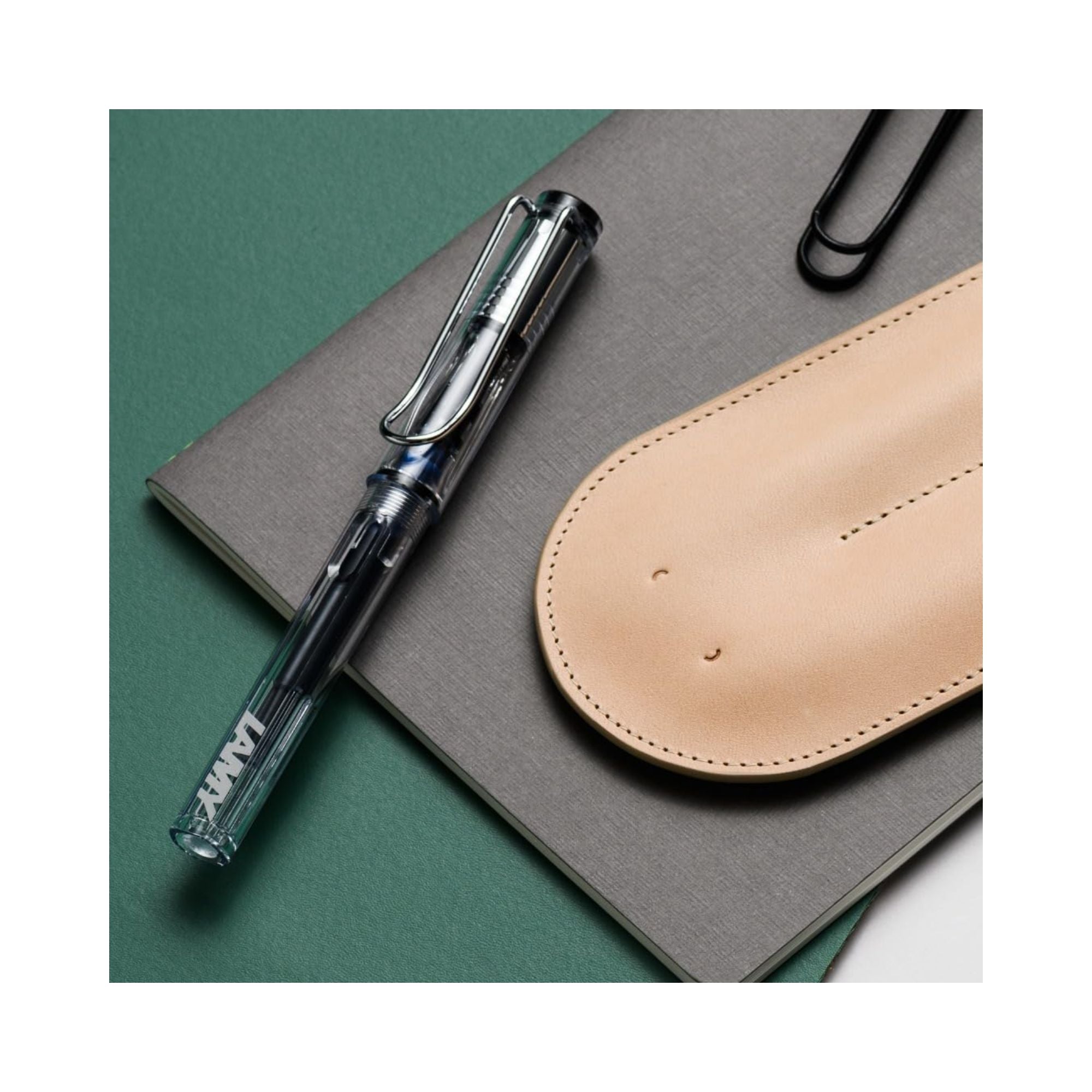 Classic safari design fountain pen in fade-resistant crystal-clear barrel that reveals the inner life of the pen. Tough ABS plastic, triangular fingergrip area, ink level window and strong chrome-plated brass pocket clip. Fountain pen comes fitted with the Z28 converter for bottled ink. A cartridge can also be used. This pen features a steel nib. Also Available with Broad, Extra Fine and Fine Nib.