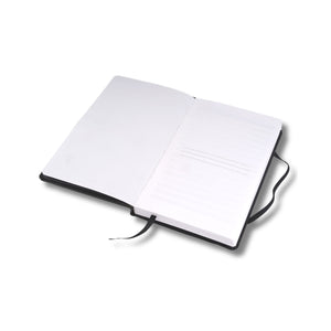 - Hardbound notebook with premium black leatherette cover