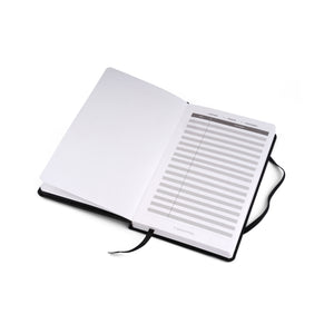 - Hardbound notebook with premium black leatherette cover