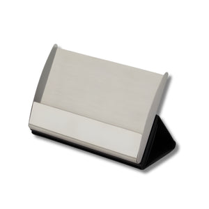 The sleek business card holder is meticulously crafted using premium leatherette wrapped around a sturdy stainless-steel frame. It slips easily into your pocket or bag and can be folded and placed on your desktop for easy access to cards. The piece can comfortably accommodate up to 20 business cards.