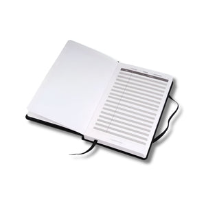 - Hardbound notebook with premium black leatherette cover